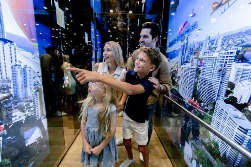 Going up 77 floors in a lift in 38 seconds has never been so entertaining! Recently SkyPoint on the Gold Coast completed a once in 20-year upgrade of the SkyPoint elevators, with the new lifts not only being faster and smoother, but also featuring high impact floor to ceiling video screens. The brief to us was to create some visual magic for the screens that would enthral and entertain guests as they whizzed up and down the building. SkyPoint wanted the films to capture the very essence of the Gold Coast, so we created a concept where SkyPoint became a surreal ocean ‘bommie’ with all kinds of life and iconic Gold Coast imagery swirling around it. The result is a whimsical, dreamlike journey where majestic whales float by effortlessly, Kombi vans sprout wings, koalas ride jet skis, and pink flamingo pool toys dot the sky.